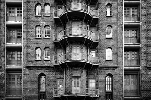 71494306 – Backsteingebäude, symmetrische Balkone, historische Lagerhäuser in Hamburg, Speicherstadt, Deutschland