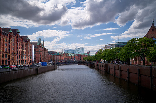 71494308 – Backsteingebäude und Kanal in der Hamburger Speicherstadt mit Blick auf die Elbphilharmonie, Hamburg, Deutschland
